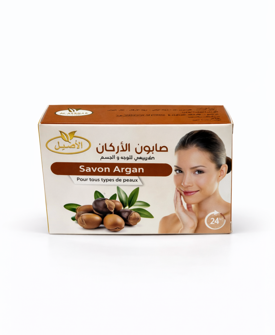 Le Savon Argan est un savon cosmétique présenté sous forme de pain solide, destiné à l’hygiène quotidienne du visage et du corps, comme indiqué sur l’emballage. Inspiré de l’usage cosmétique traditionnel de l’argan, il offre un nettoyage doux et agréable.